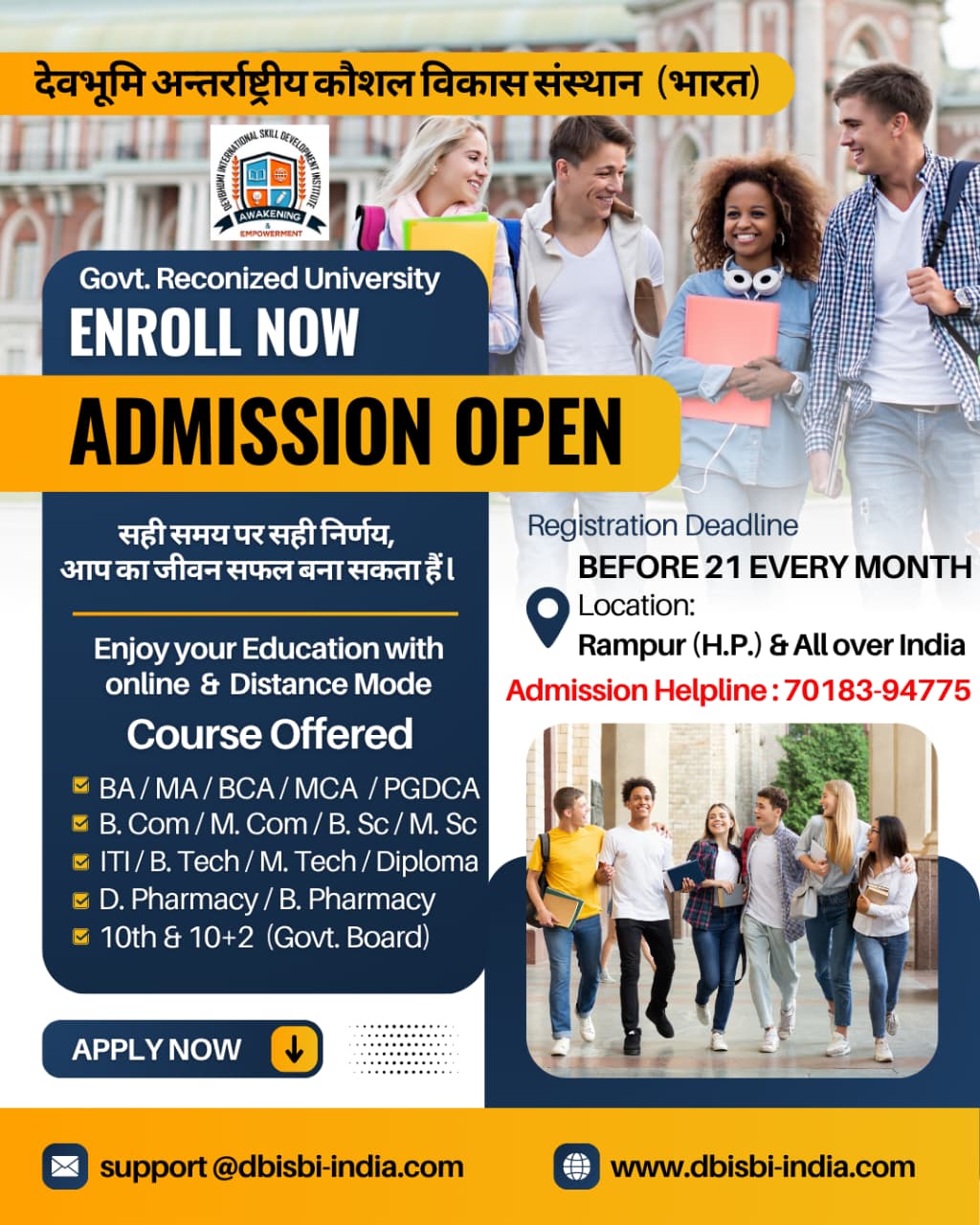 Devbhumi International Skill Development Institute (DBISDI) is an autonomous organization, Established Under Government of India, Ministry of Corporate Affairs CIN : U85500HP2025PTC011527. An ISO 9001:2015 Certified India's Most Demanding Education and Technology Organization. DBISDI accredited under Universities for Provide Courses of Diploma, Degree under University Grants Commission (UGC) & All India Council for Technical Education (AICTE).